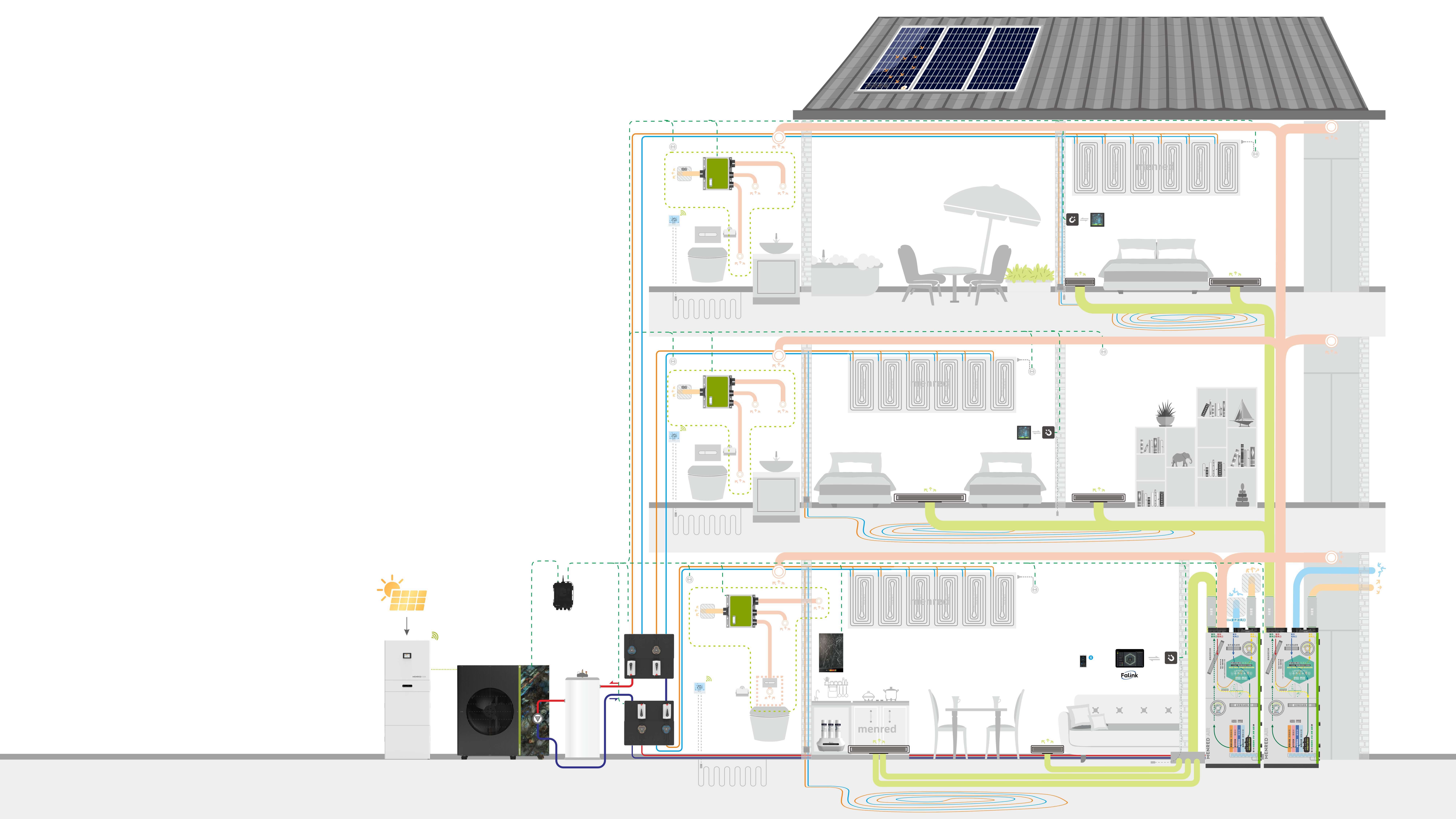 The indoor climate system relies onwater-based radiant distribution, while refrigerant-based equipment remains outside occupied areas. This design improves safety while reducing potential maintenance risks.