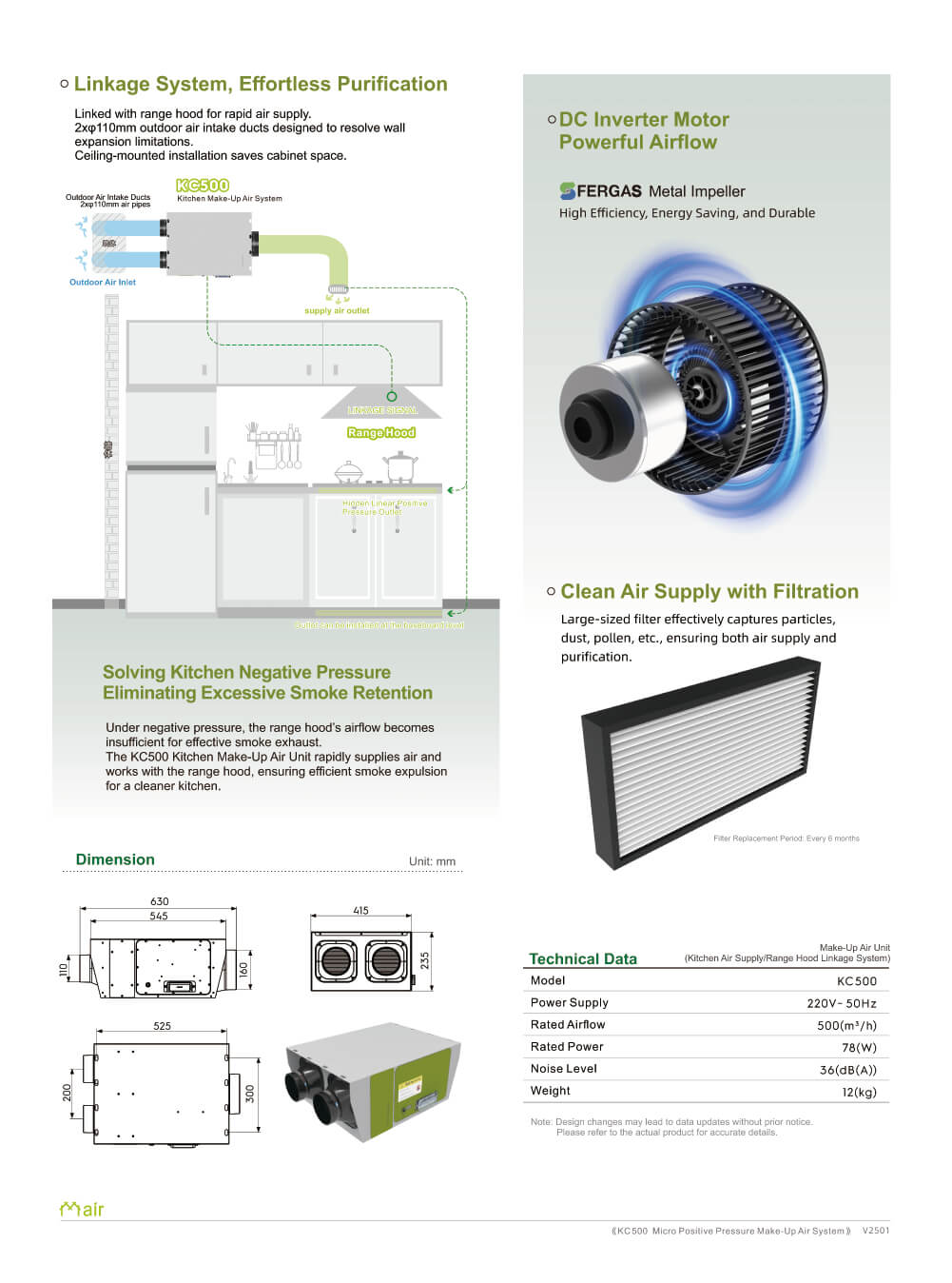 Equipped with a DC inverter motor and a FERGAS metal impeller, the KC500 ensures reliable airflow with low energy consumption and minimal noise.