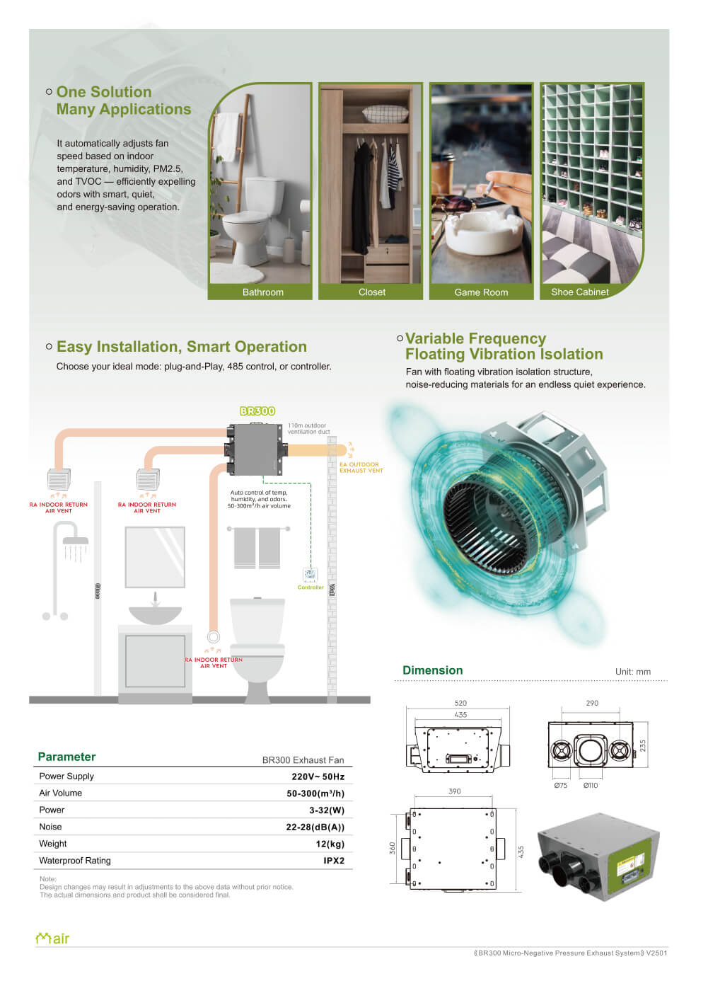 Equipped with built-in sensors, the BR300 automatically monitors humidity, PM2.5, and TVOC levels. It intelligently adjusts fan speed in real-time to efficiently expel stale air, smoke, and unpleasant odors. With its energy-saving variable frequency control, the system ensures optimal performance with minimal power consumption (3–32W), achieving both comfort and sustainability.